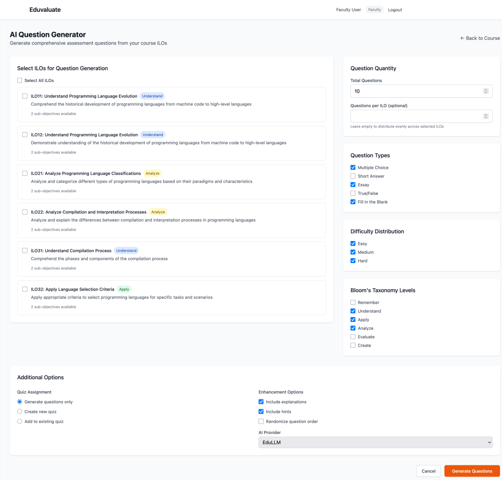 At the heart of Eduvaluate lies AI-powered question generation, engineered to align with Bloom’s Taxonomy and learning outcomes. This means you can automatically generate high-quality questions that match targeted skill levels and educational goals—saving hours of question-writing and ensuring consistency across assessments.